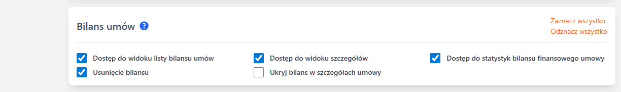 Uprawnienie wyświetla zakładkę „Bilans umów” w lewym menu systemu. Umożliwia przegląd wszystkich bilansów w systemie