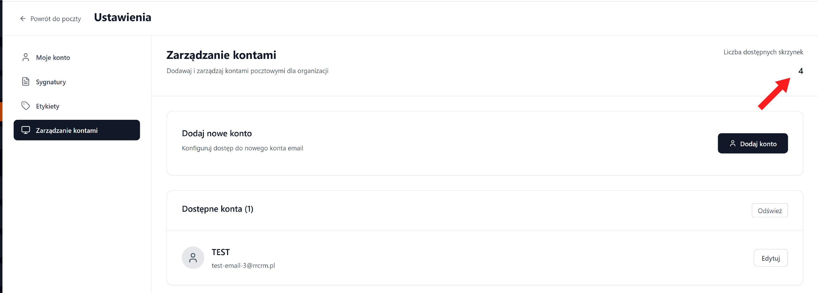 Użytkownik z tym uprawnieniem widzi w ustawieniach ile skrzynek ma aktualnie dostępnych.