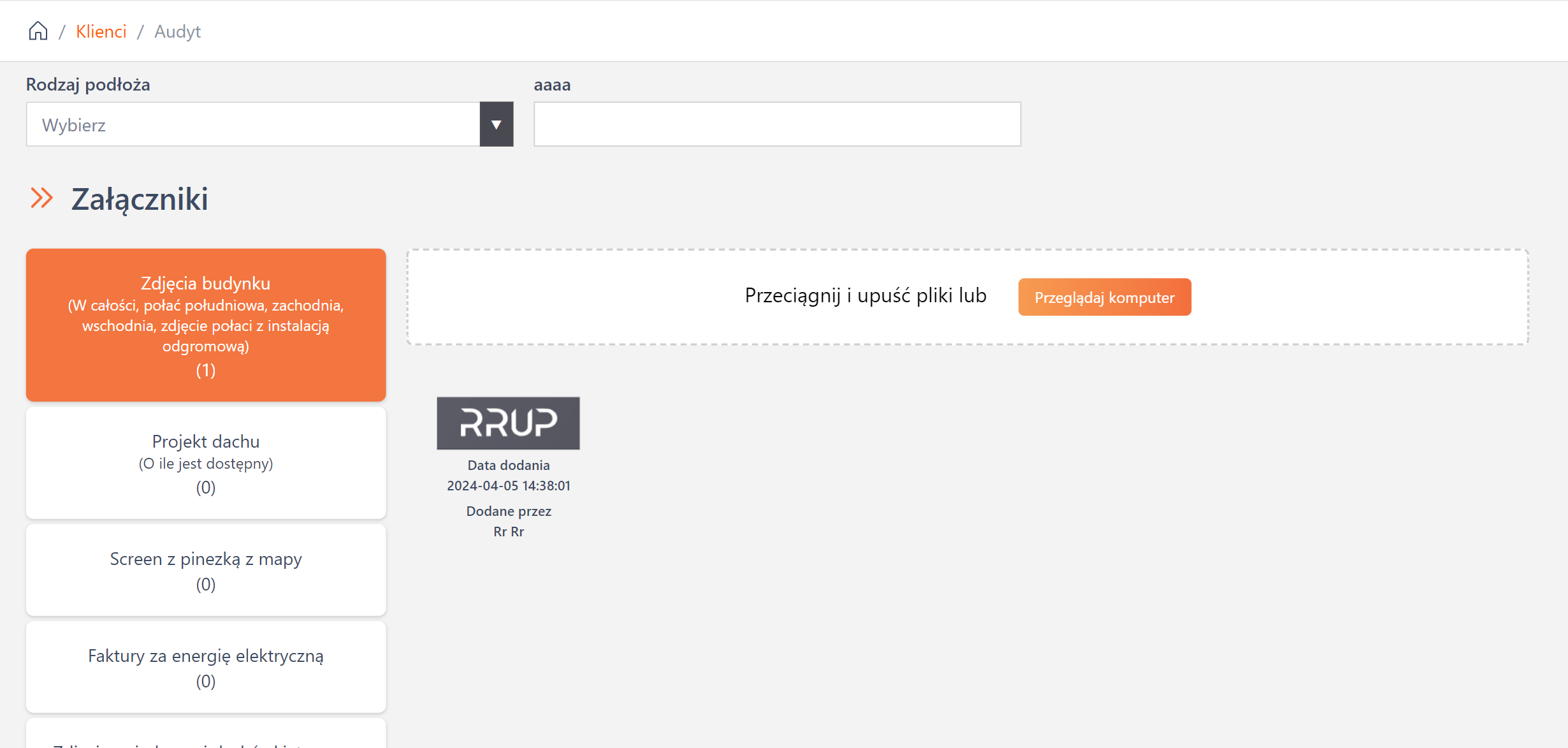 Po przejściu do szczegółów klienta i wybraniu zakładki "Audyt" w polu "Załączniki" ukaże się skonfigurowany typ plików.