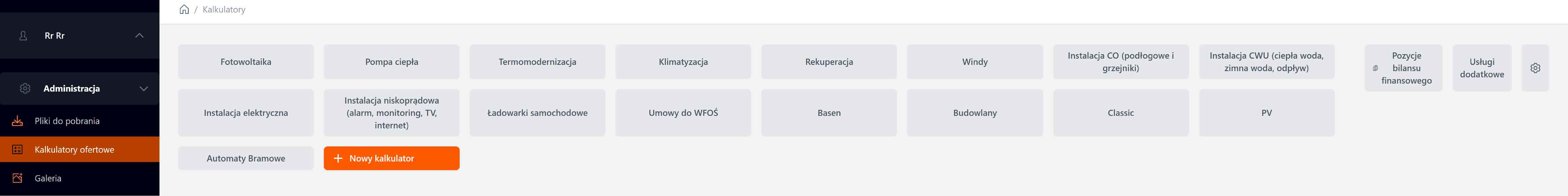 W panelu bocznym "Administracja" > "Kalkulatory ofertowe" użytkownikowi ukaże się widok kalkulatorów.