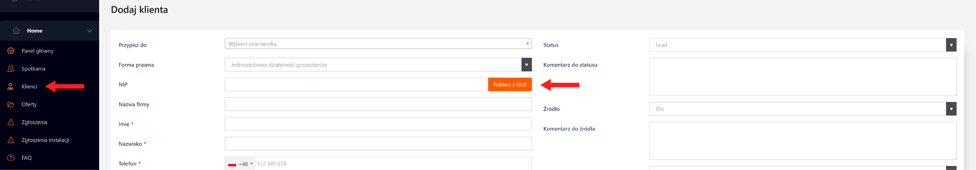 Informacje z GUS można pobrać w zakładce Klienci > następnie w polu NIP klikając przycisk "Pobierz z GUS".