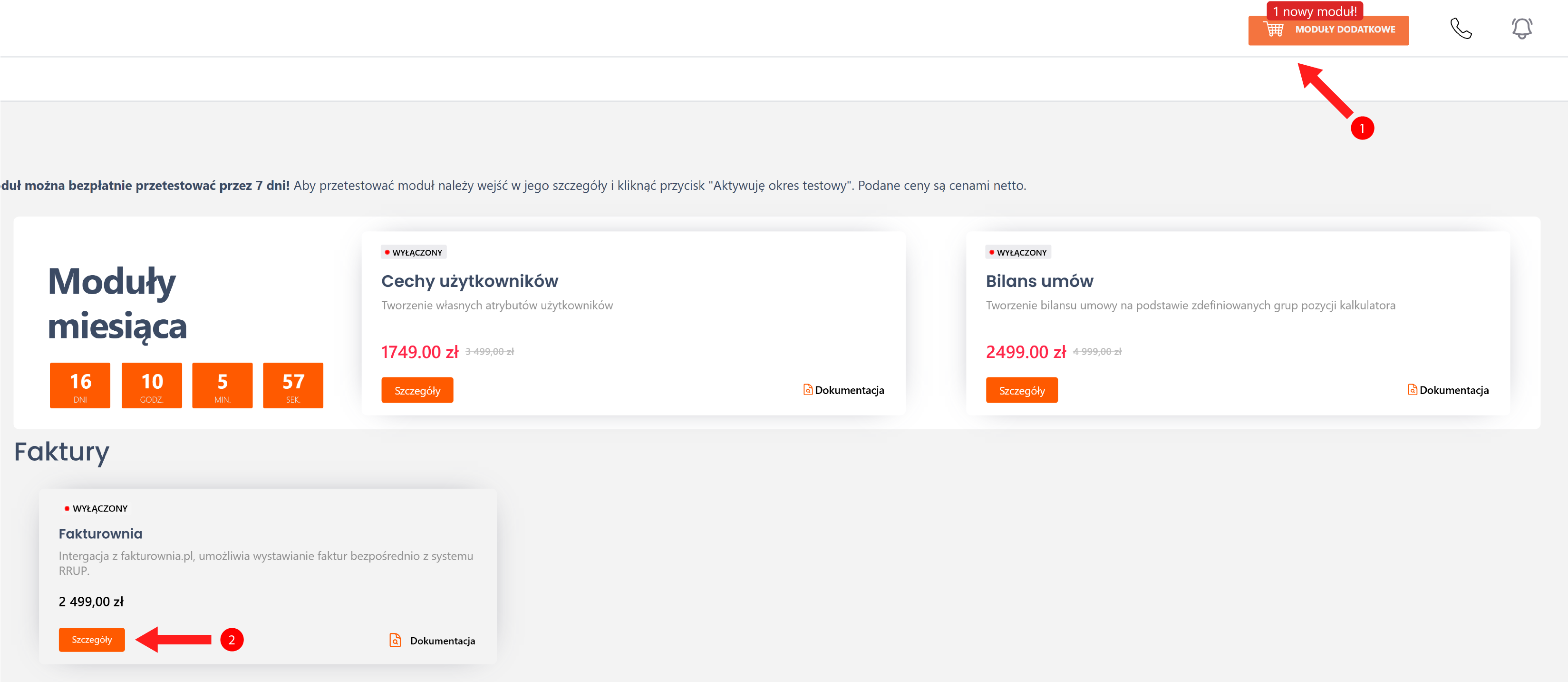 Konfiguracja platformy fakturownia.pl z naszym systemem CRM odbywa się poprzez (1) Moduły dodatkowe -> Fakturownia -> (2) Szczegóły