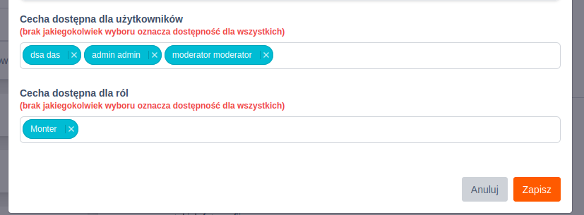 Jeśli nie zostaną wskazane role ani użytkownicy, cecha jest dostępna dla wszystkich użytkowników. Po wskazaniu konkretnych ról lub użytkowników, dostęp do cechy mają wyłącznie wybrane osoby.