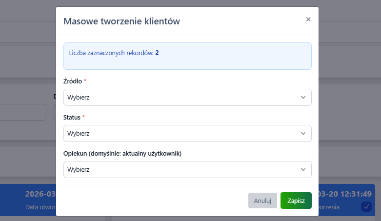 Przy każdej pozycji na liście dostępny jest checkbox, który pozwala zaznaczyć wybrane rekordy. Po zaznaczeniu co najmniej jednego leada pojawia się przycisk „Utwórz klientów”.