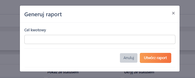 Przy próbie generowania raportu wyświetlane jest okno modalne, które pozwala na opcjonalne zdefiniowanie Celu kwotowego dla handlowców.