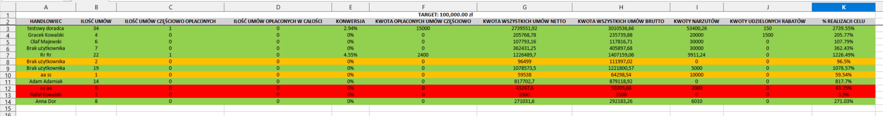 - Zdefiniowanie celu: Wiersze w raporcie zostaną wyróżnione kolorystycznie w zależności od stopnia realizacji założonego planu: