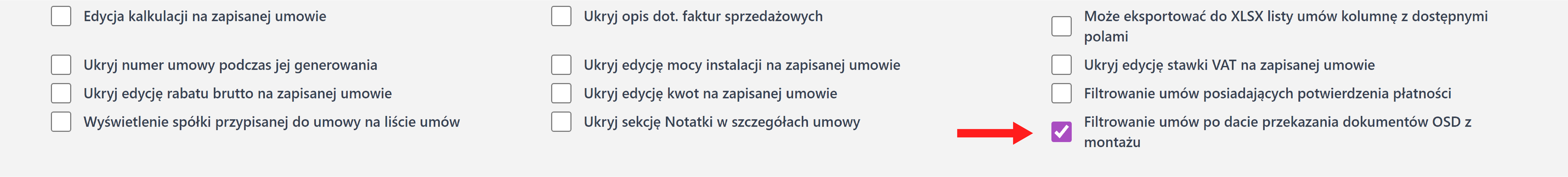 Aby filtr "Data przekazania dokumentów OSD" był widoczny na liście umów, użytkownik musi posiadać uprawnienie: Filtrowanie umów po dacie przekazania dokumentów OSD z montażu.