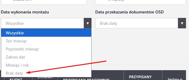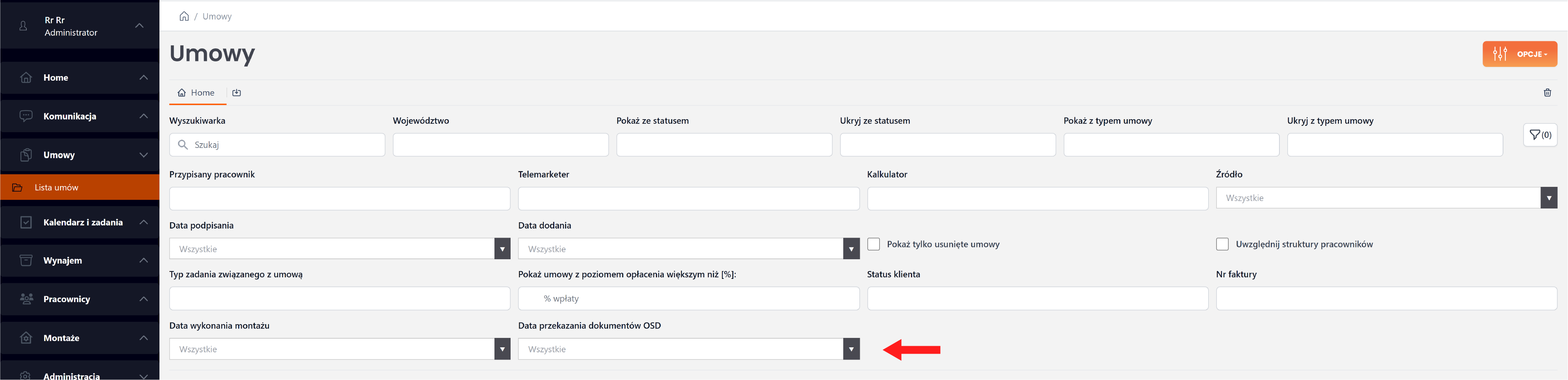 Na liście umów został wprowadzony filtr "Data przekazania dokumentów OSD", który umożliwia wyszukiwanie umów na podstawie daty przekazania dokumentów do OSD. Data ta jest uzupełniana bezpośrednio z poziomu modułu montażu.