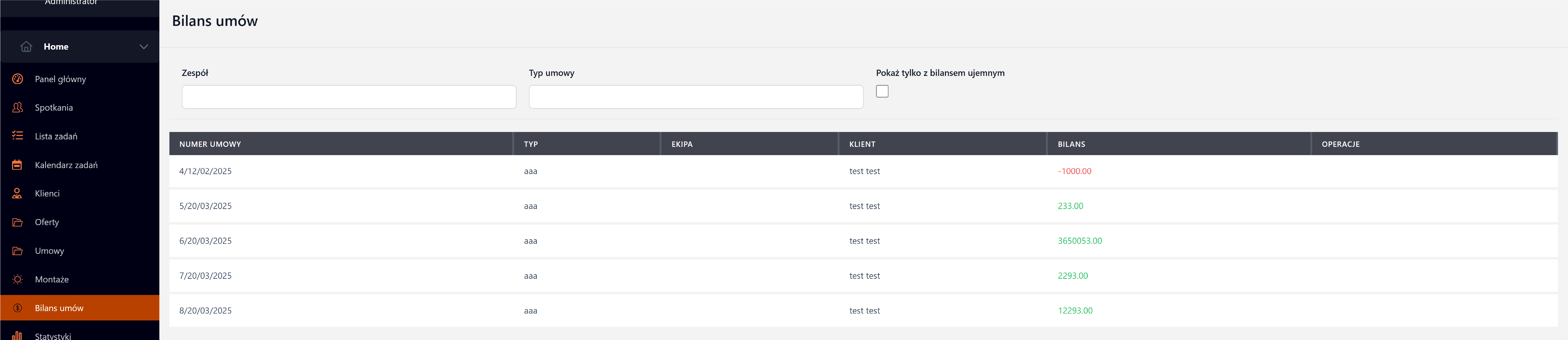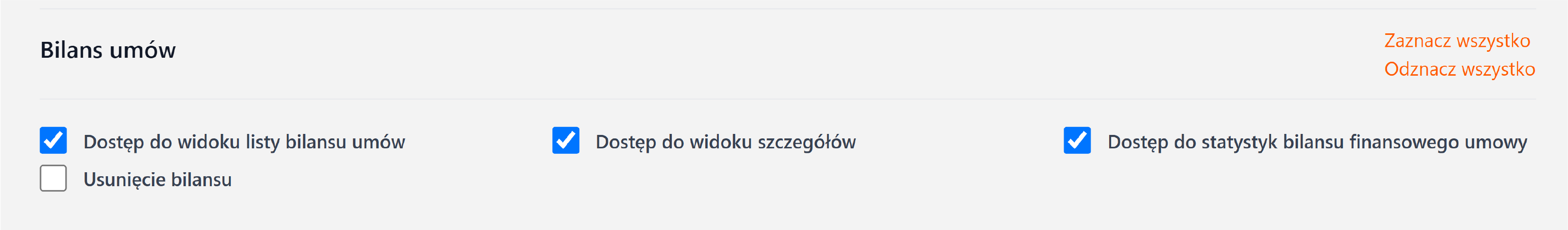 Uprawnienie wyświetla zakładkę „Bilans umów” w lewym menu systemu. Umożliwia przegląd wszystkich bilansów w systemie