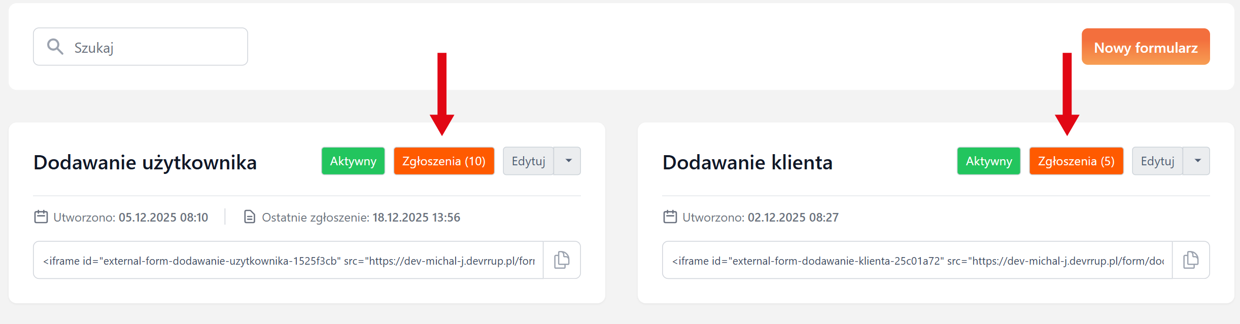 Uprawnienie pozwala na dostęp do przesłanych zgłoszeń za pomocą przycisku "Zgłoszenia"