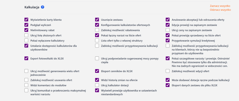 Uprawnienie pozwala użytkownikowi otrzymać dostęp do zakładki "Kalkulatory ofertowe"