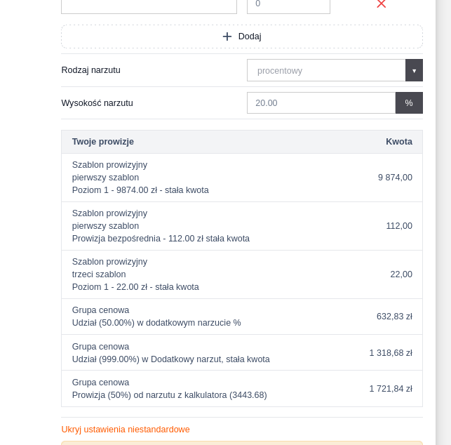 Pokaż szczegółowe narzuty i prowizje. Ostrożnie! Powinno być stosowane tylko dla administracji. Nie ma żadnych ograniczeń w widoczności cen.
