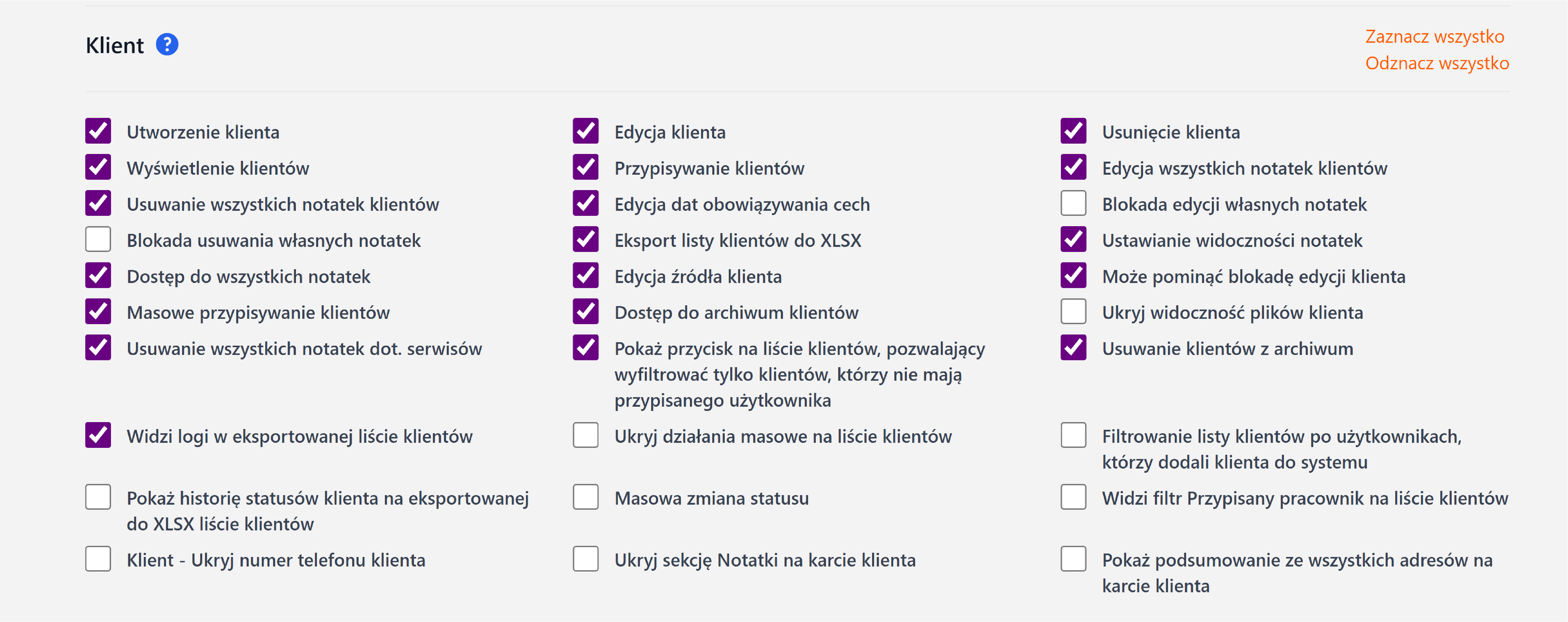 Uwaga aktywne uprawnienie "Usuwanie wszystkich notatek klientów" nadpisze omawiane uprawnienie.