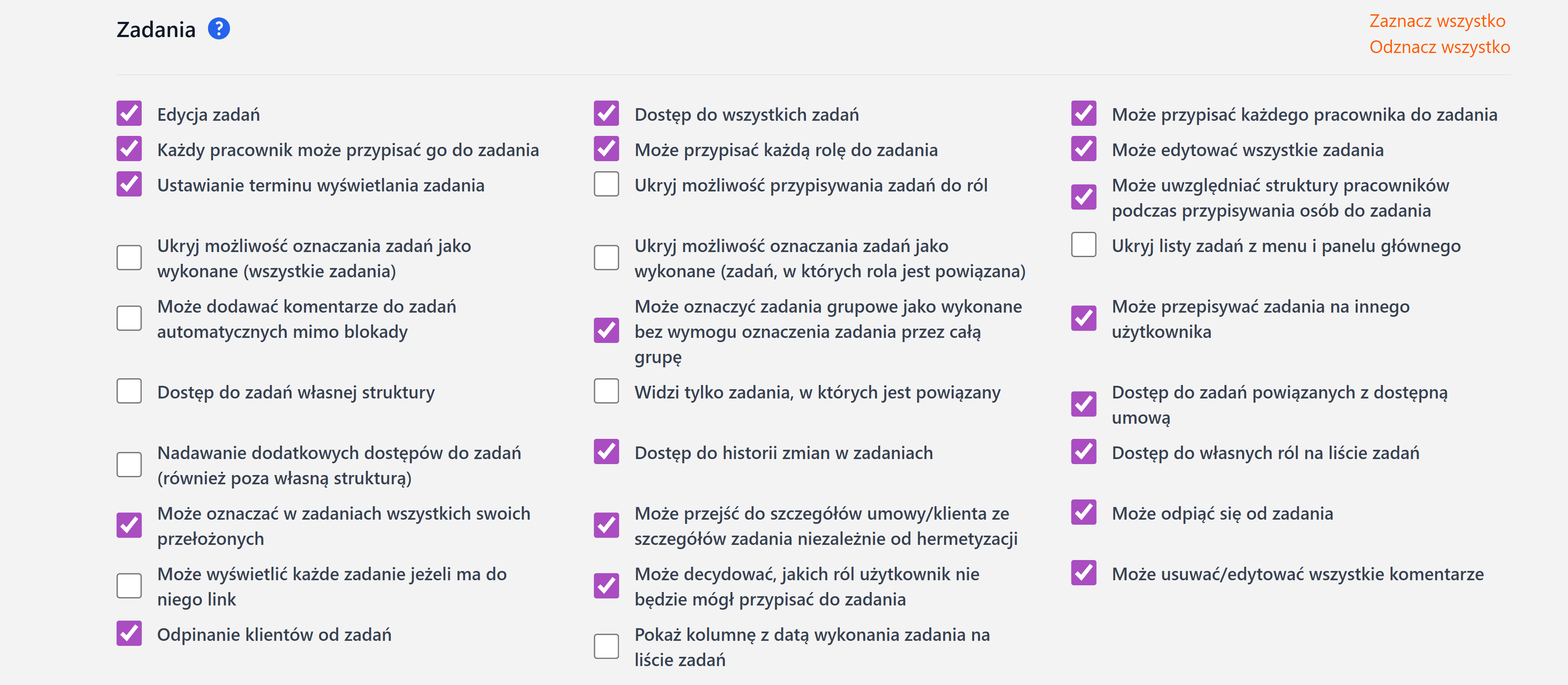 Uprawnienie ukrywa możliwość oznaczania zadań jako wykonane - dotyczy wszystkich zadań.
