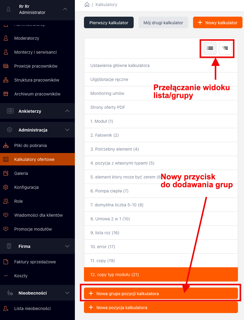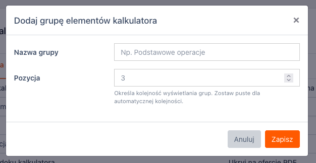 przycisk "+ Nowa grupa pozycji kalkulatora"