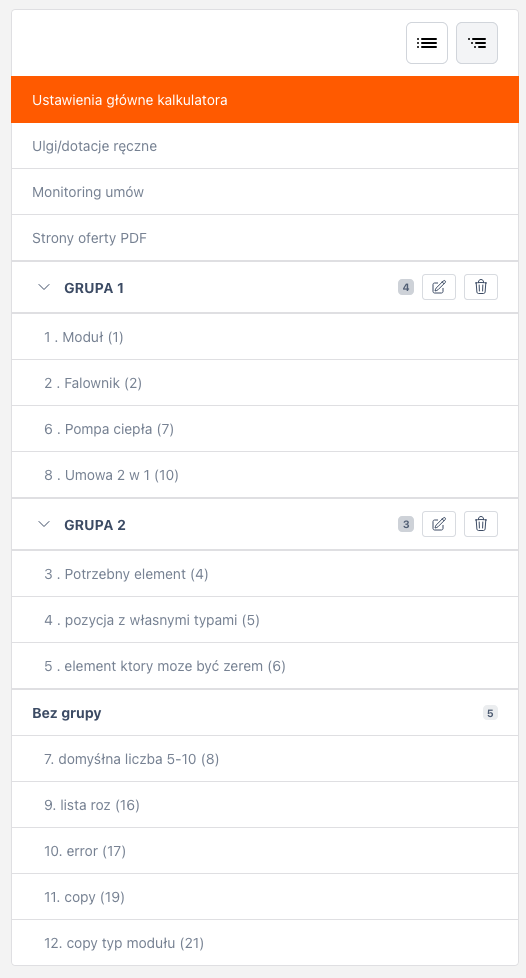 W momencie dodawania nowej pozycji w kalkulatorze, użytkownik ma możliwość przypisania jej do jednej z wcześniej utworzonych grup.