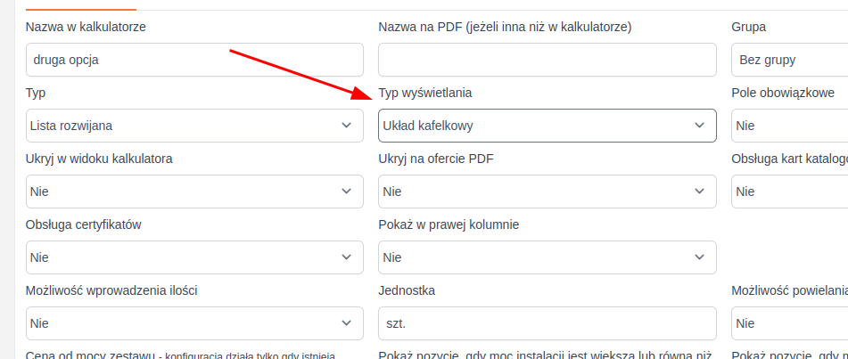 Konfiguracja pozycji kalkulatora - Typ pozycji kalkulatora