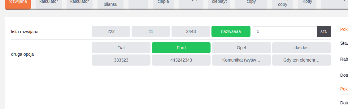W konfiguracji kalkulatora, podczas dodawania lub edycji pozycji, dla typu pola: lista rozwijana dostępne są dwie opcje sposobu wyświetlania: