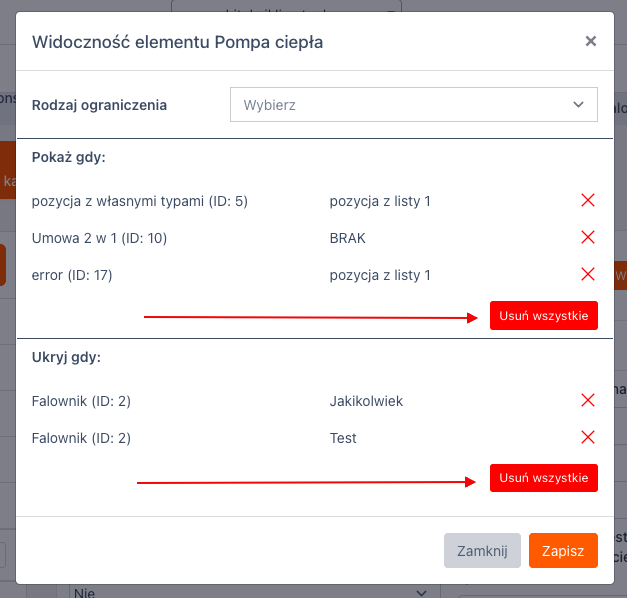 Przycisk „Usuń wszystkie” pozwala na usunięcie wszystkich ograniczeń w danej grupie (Pokaż gdy / Ukryj gdy).