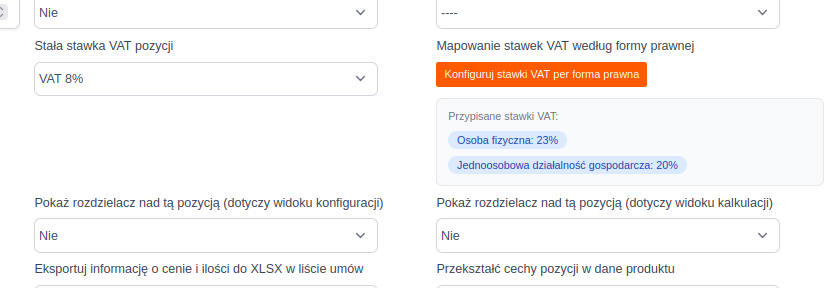 Po zapisaniu tej opcji, w konfiguracji wybranej pozycji kalkulatora pojawi się dodatkowe pole „Mapowanie stawek VAT według formy prawnej”.