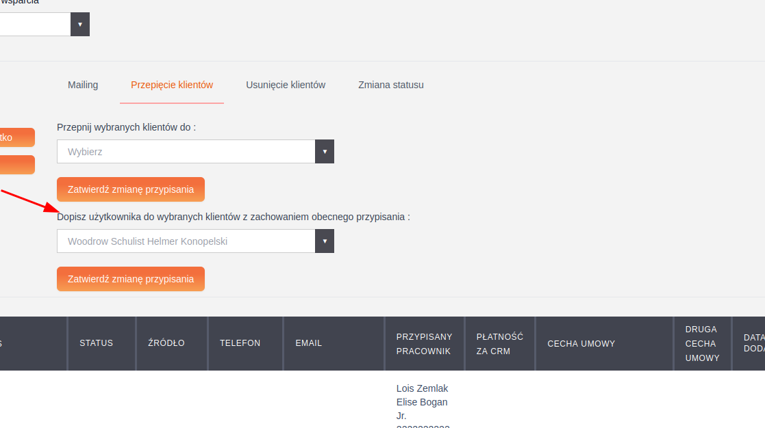 Opcja "Przepięcie klientów" rozwija możliwość masowego przeniesienia wybranych klientów do innego użytkownika. Proces ten polega na wybraniu z listy "Przepnij wybranych klientów do:" pracownika i przypisaniu wybranych klientów do jego konta. Dzięki temu narzędziu możliwe jest szybkie i efektywne zarządzanie przypisanymi klientami, umożliwiając łatwe przypisanie ich do odpowiednich pracowników.