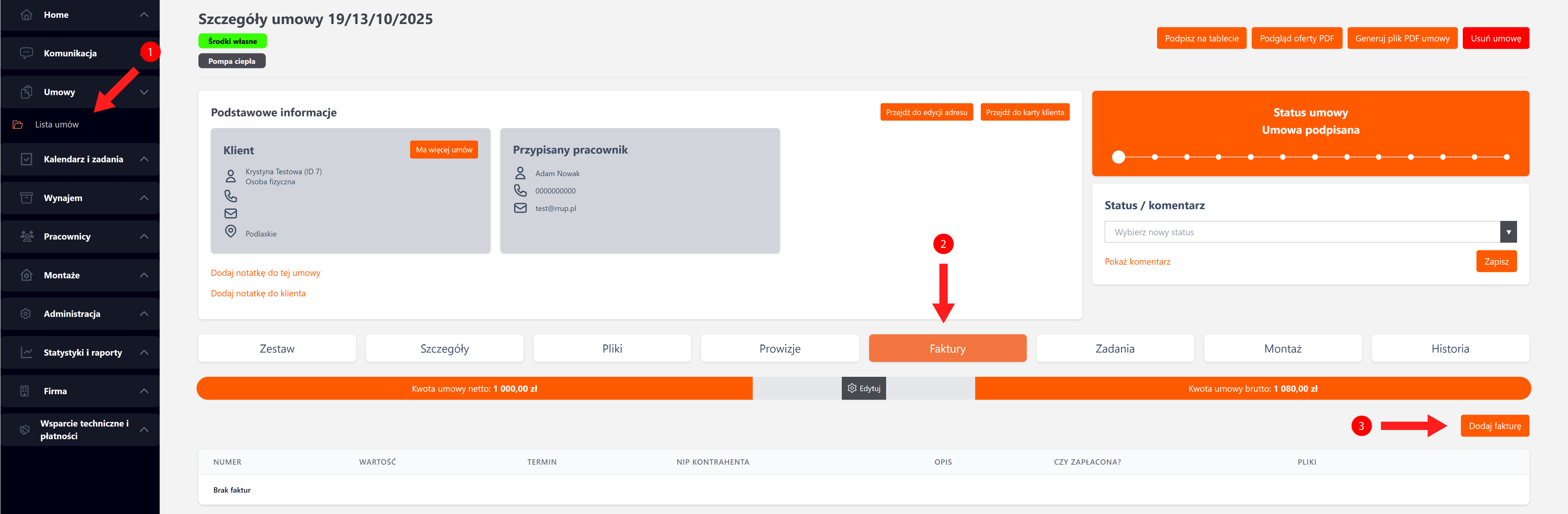 Użytkownik zostanie przeniesiony do widoku szczegółów umowy, a w nim należy wybrać (2) "Faktury" -> (3) "Dodaj fakturę".