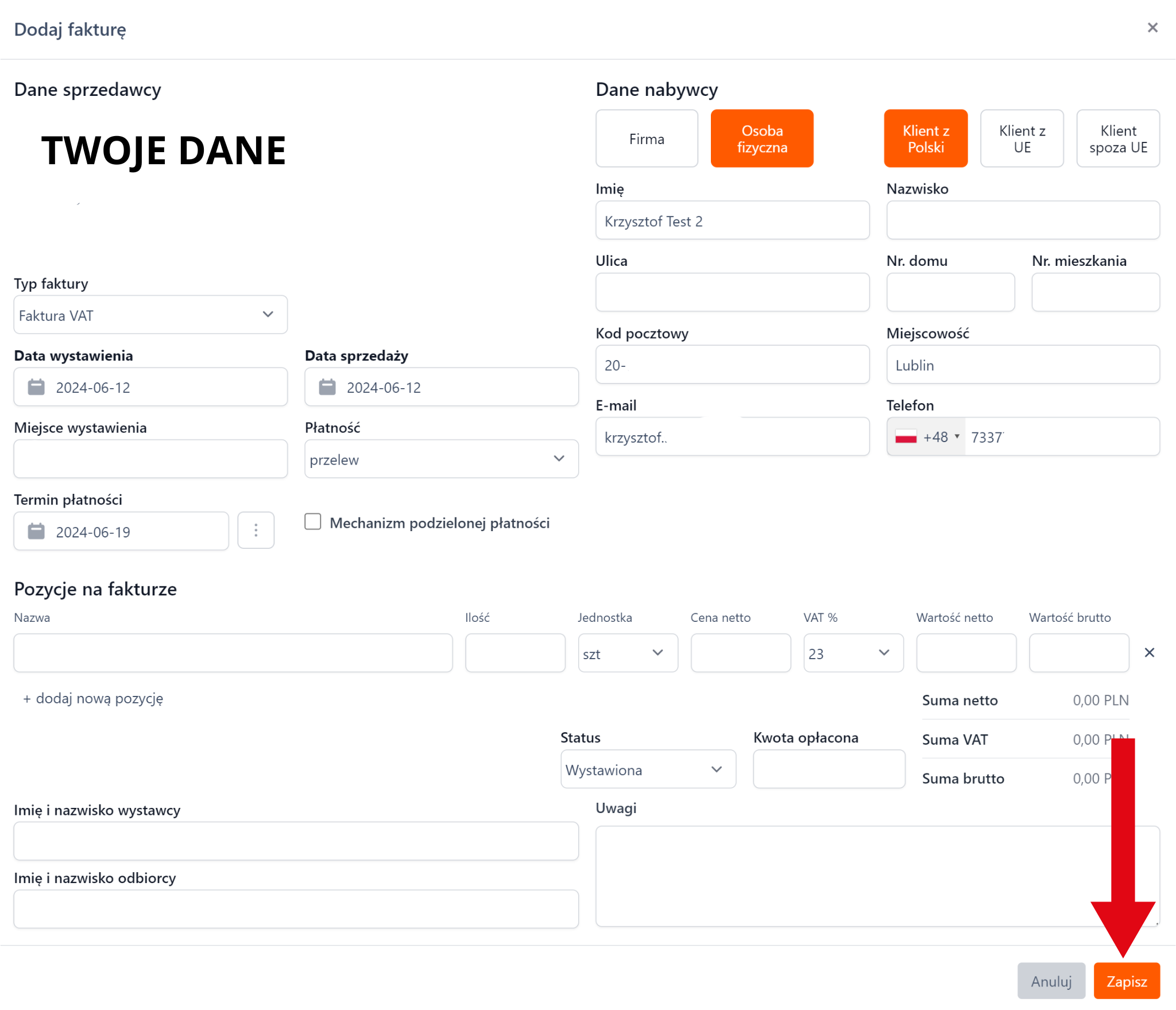 Po wprowadzeniu danych należy kliknąć "Zapisz".