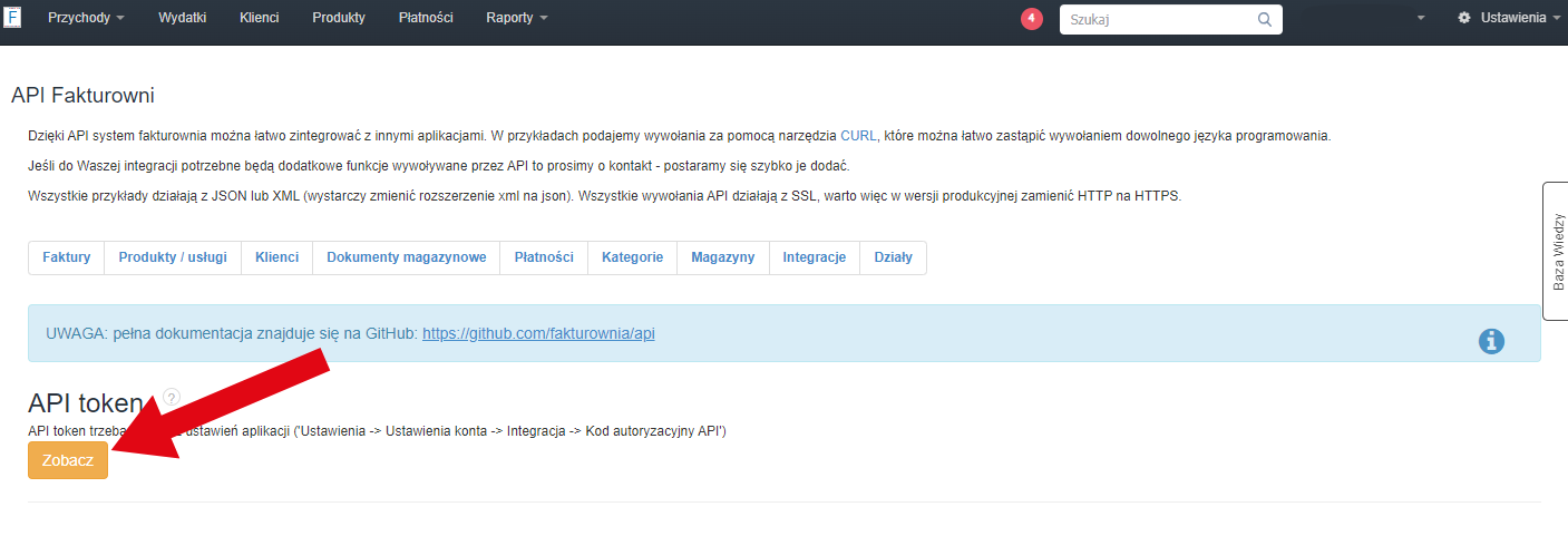 Użytkownik zostanie przeniesiony do zakładki API fakturowni. We wskazanym miejscu należy kliknąć "Zobacz".