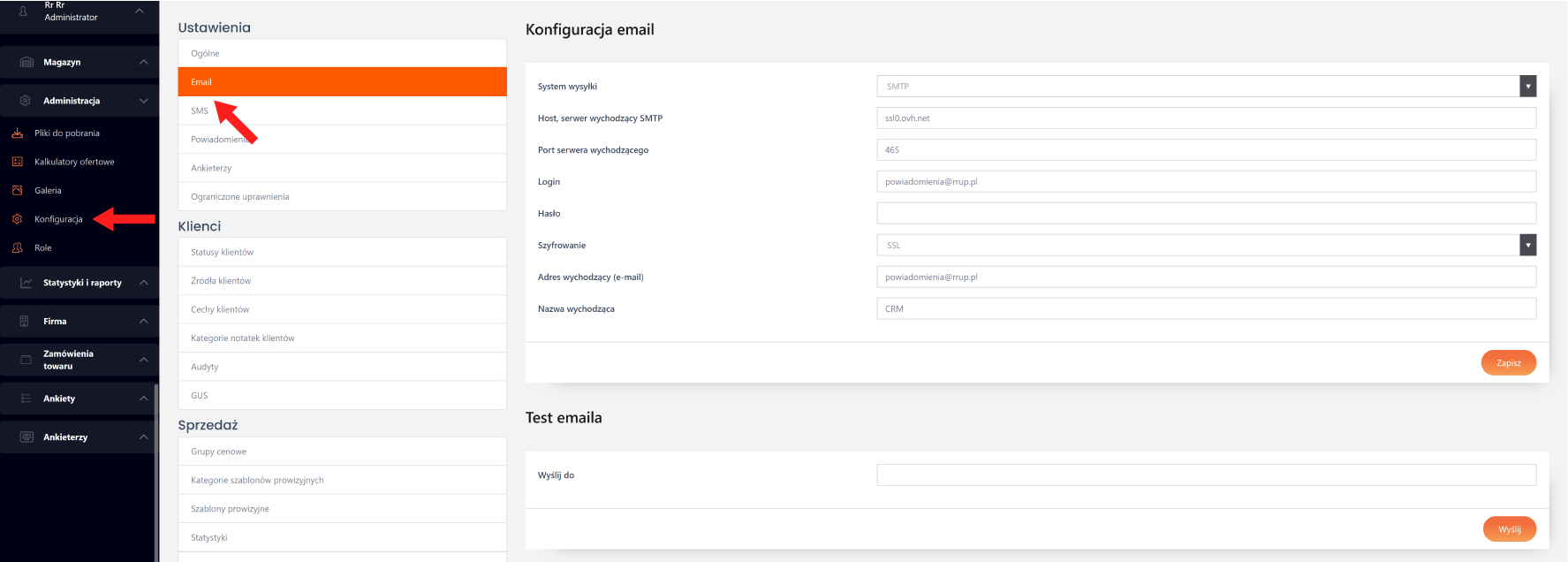 Informacje dotyczące konfiguracji głównej skrzynki e-mail znajdują się w systemie CRM. Znajduje się w zakładce "Konfiguracja" - "E-mail". Dostęp do tej konfiguracji umożliwia spersonalizowanie skrzynki ogólnej zgodnie z preferencjami użytkownika.