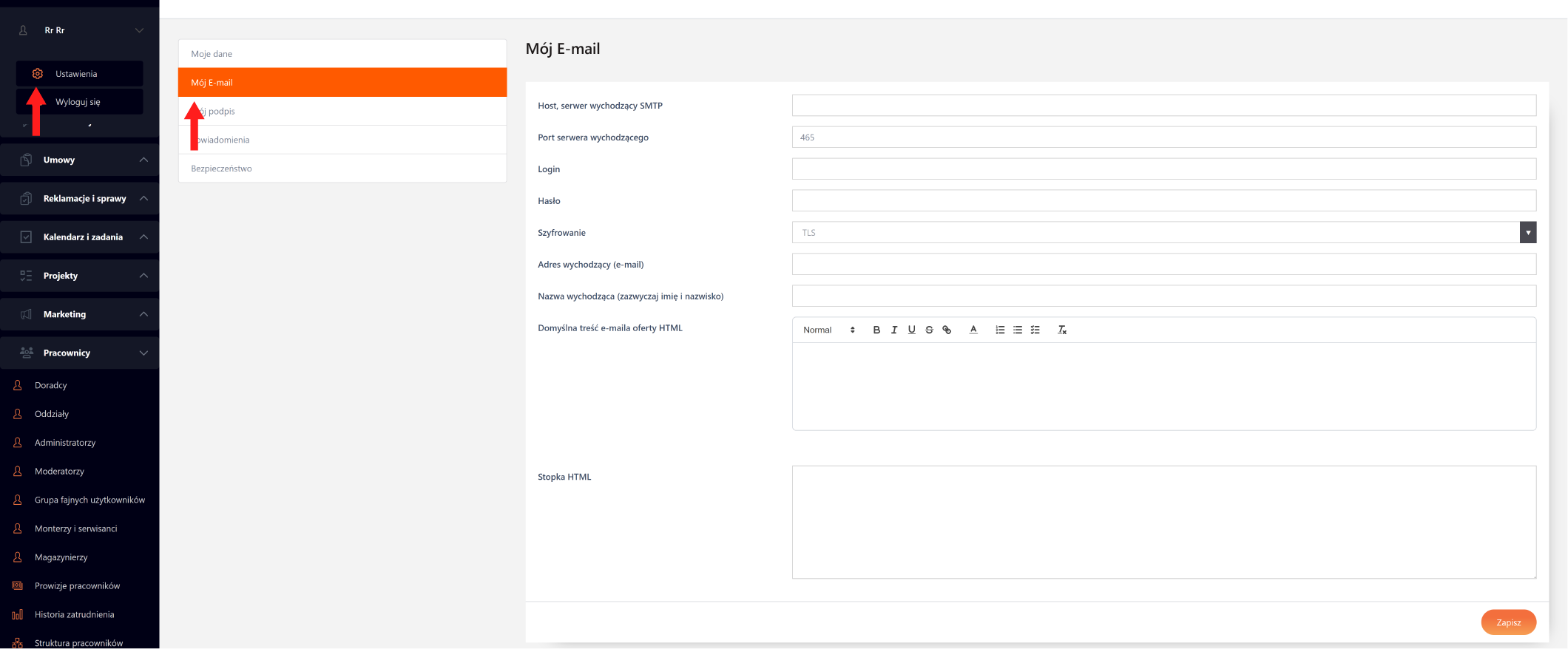 W sekcji "Ustawienia" w prawym górnym rogu systemu CRM, znajdziemy zakładkę "Mój E-mail", gdzie każdy użytkownik może dostosować swoją imienną skrzynkę e-mail, uwzględniając indywidualne preferencje.