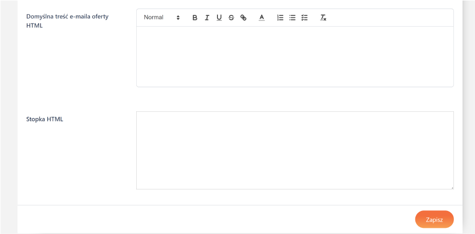 Istnieje możliwość konfiguracji domyślnej treści e-maila z ofertą oraz stopki. Użytkownik może dodatkowo dostosować stopkę, dodając kod HTML.