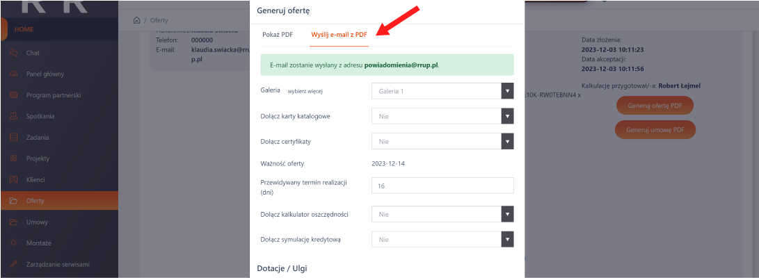 Podczas generowania oferty w systemie CRM, użytkownik ma możliwość wskazania, czy oferta ma być wysłana do klienta drogą e-mailową, co ułatwia szybką i efektywną komunikację z klientami.
