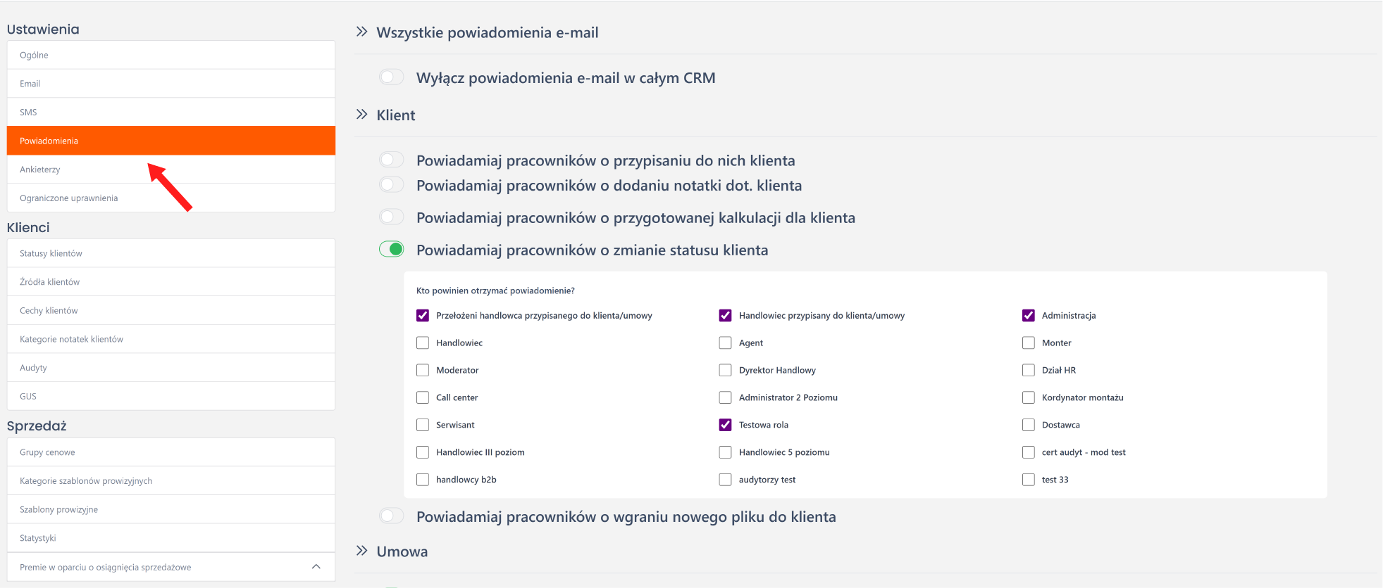 W zakładce "Konfiguracja" -> "Powiadomienia" jest możliwość ustawienia powiadomień. Konfiguracja umożliwia użytkownikom dostosowanie w jaki sposób otrzymują powiadomienia związane z klientami, umowami i montażami w systemie.