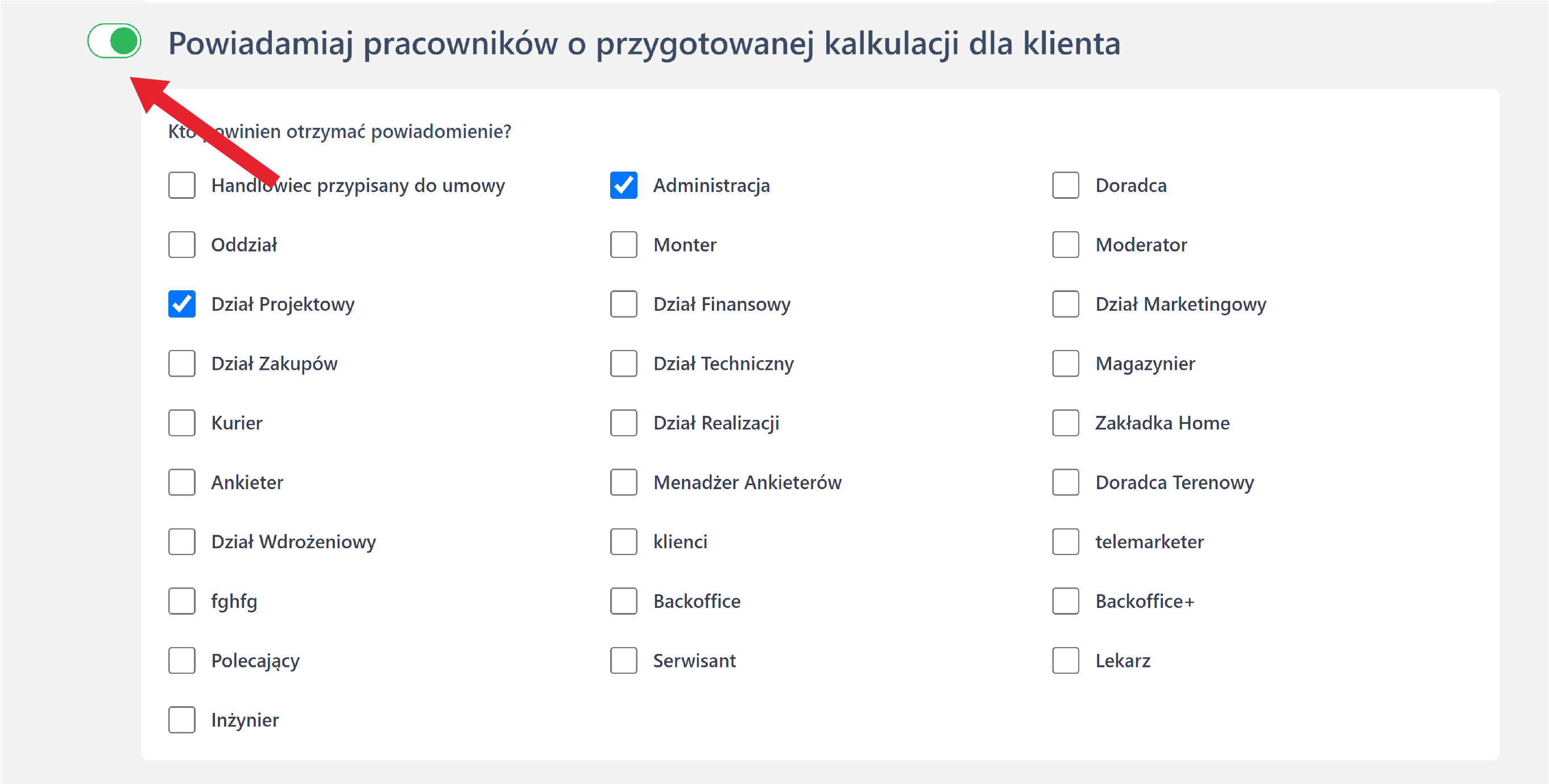 "Powiadamiaj pracowników o przygotowanej kalkulacji dla klienta" - zakładka pozwala na określenie, która grupa pracowników powinna otrzymywać powiadomienia dotyczące przygotowanej kalkulacji.