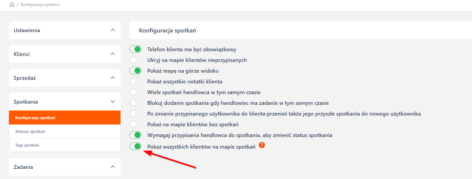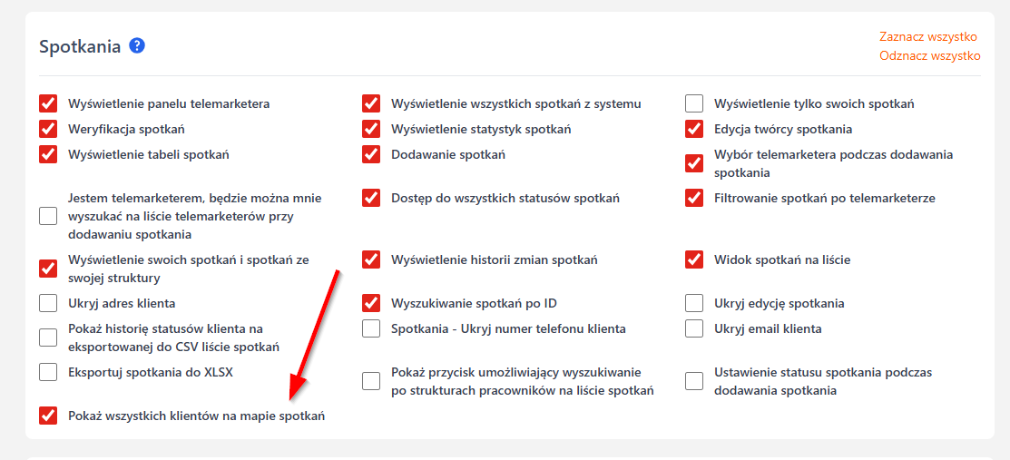 Po nadaniu tego uprawnienia użytkownik uzyskuje możliwość wyświetlania wszystkich klientów na mapie spotkań.