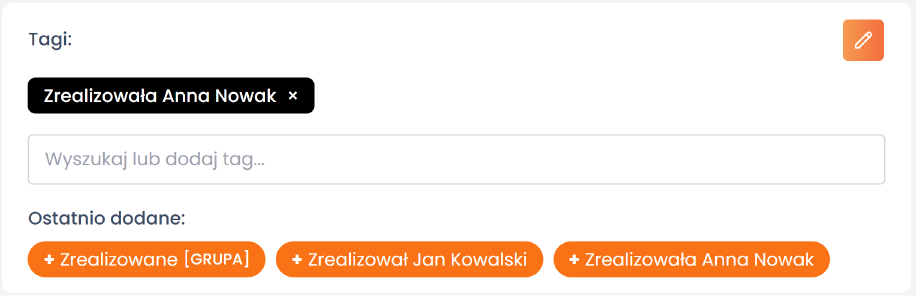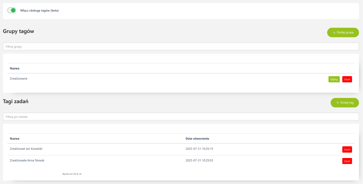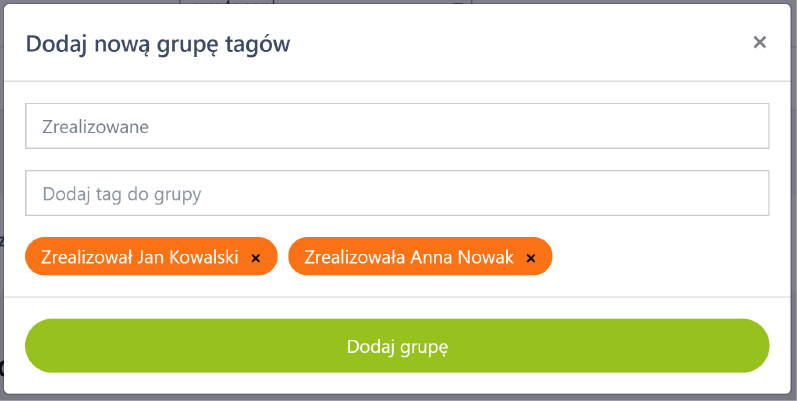 Grupa tagów to zestaw wcześniej zdefiniowanych tagów, które mogą być przypisane do zadania jednym kliknięciem. Po wybraniu grupy tagów w szczegółach zadania, automatycznie przypisywane są wszystkie tagi należące do tej grupy.