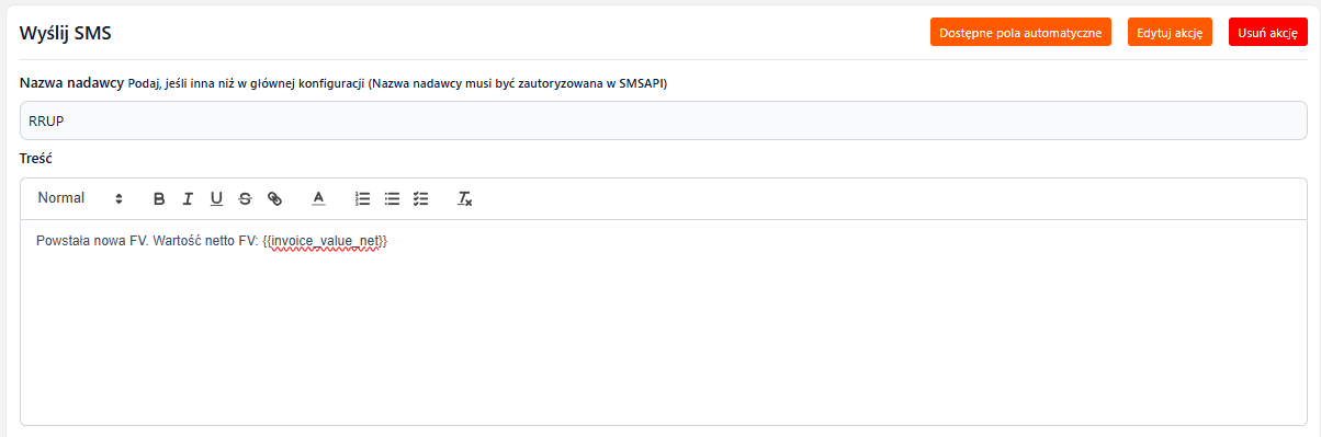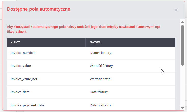 Podczas tworzenia treści wiadomości można korzystać z pól automatycznych - czyli danych pochodzących bezpośrednio z faktury, takich jak: