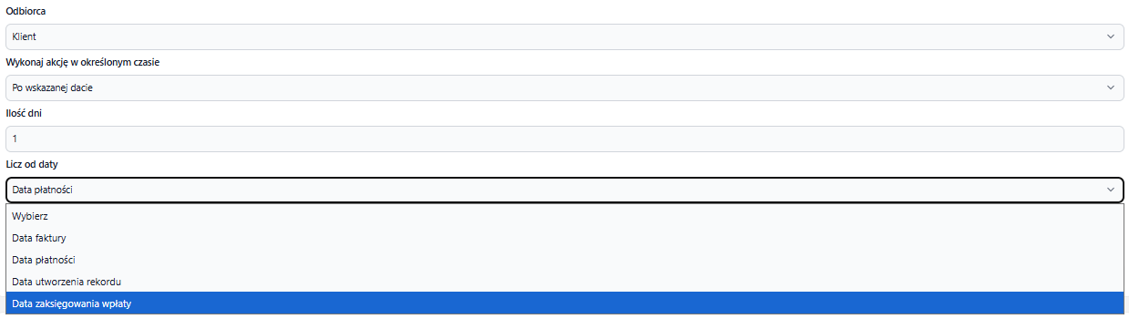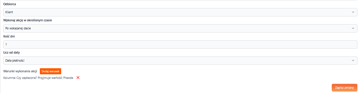 Aby skonfigurować powiadomienie dla klienta o zbliżającej się płatności lub o przekroczeniu terminu płatności, należy w akcji automatycznej w polu "Odbiorca" wybrać opcję "Klient". W polu "Wykonaj akcję w określonym czasie" należy określić, czy akcja ma się wykonać przed wskazaną datą, czy po upływie terminu.