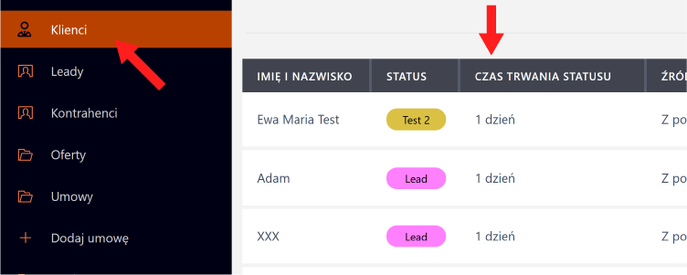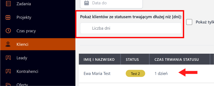 Informacja o liczbie dni statusu znajduje się bezpośrednio na liście klientów. Dla każdego klienta widoczny jest licznik, który wskazuje, jak długo aktualny status pozostaje bez zmian: