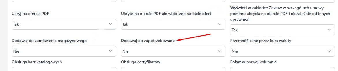 Domyślnie ustawiona jest na wartość „Tak”. Elementy oznaczone tą wartością będą uwzględniane przy tworzeniu zapotrzebowania lub zamówienia towarów.