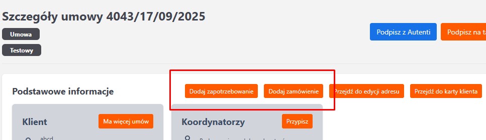 Gdy umowa osiągnie wcześniej zdefiniowany status, zostanie przeniesiona do panelu "Zapotrzebowanie". Z tego miejsca użytkownik może podejmować decyzje dotyczące składania zamówień. W przypadku gdy nie ma potrzeby składania zamówienia, użytkownik ma możliwość jego usunięcia lub oznaczenia jako już zrealizowanego. Proces oznaczania odbywa się poprzez przyciski dostępne w kolumnie "Operacje".
