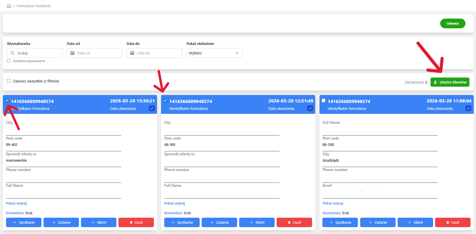 Przy każdej pozycji na liście dostępny jest checkbox, który pozwala zaznaczyć wybrane rekordy. Po zaznaczeniu co najmniej jednego leada pojawia się przycisk „Utwórz klientów”.
