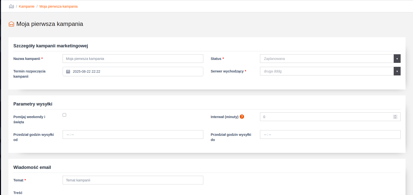 Podczas tworzenia kampanii należy wskazać jedno z wcześniej skonfigurowanych kont SMTP. Brak poprawnie skonfigurowanego konta uniemożliwia utworzenie i uruchomienie kampanii.