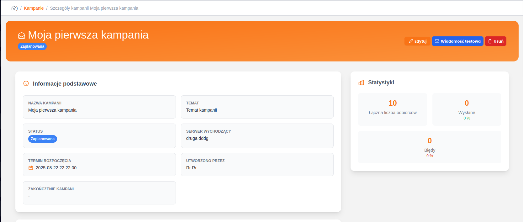 W ramach konfiguracji przewidziano również opcję wysłania testowego maila, która pozwala zweryfikować poprawność wprowadzonych ustawień jeszcze przed rozpoczęciem pracy z kampaniami.