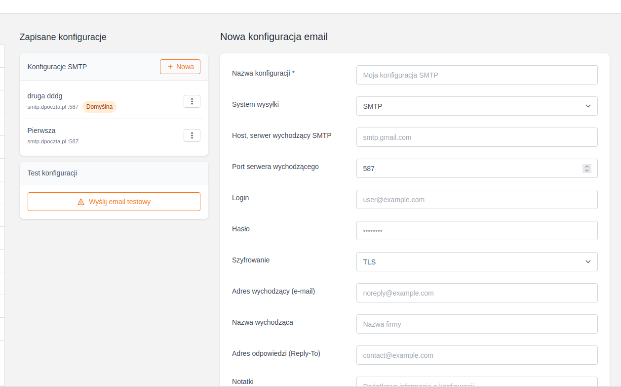 Proces konfiguracji odbywa się w zakładce Konfiguracja → Kampanie → Dodatkowe konta SMTP, gdzie możliwe jest dodanie i odpowiednie skonfigurowanie konta pocztowego wykorzystywanego do wysyłki wiadomości.