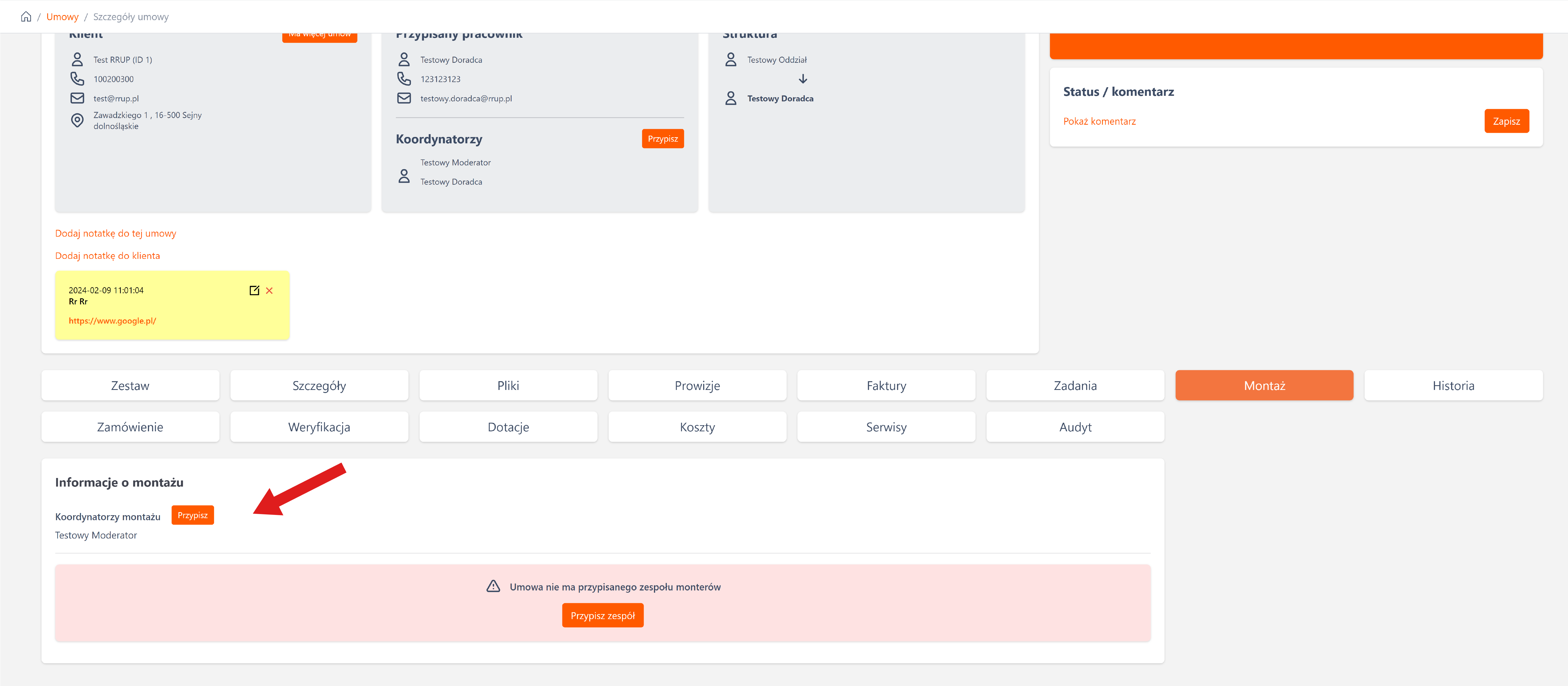 Podczas generowania umowy, system automatycznie przypisuje koordynatora na podstawie jego ustawionego rejonu. Dzięki temu każda umowa ma dedykowanego specjalistę do koordynacji montaży.