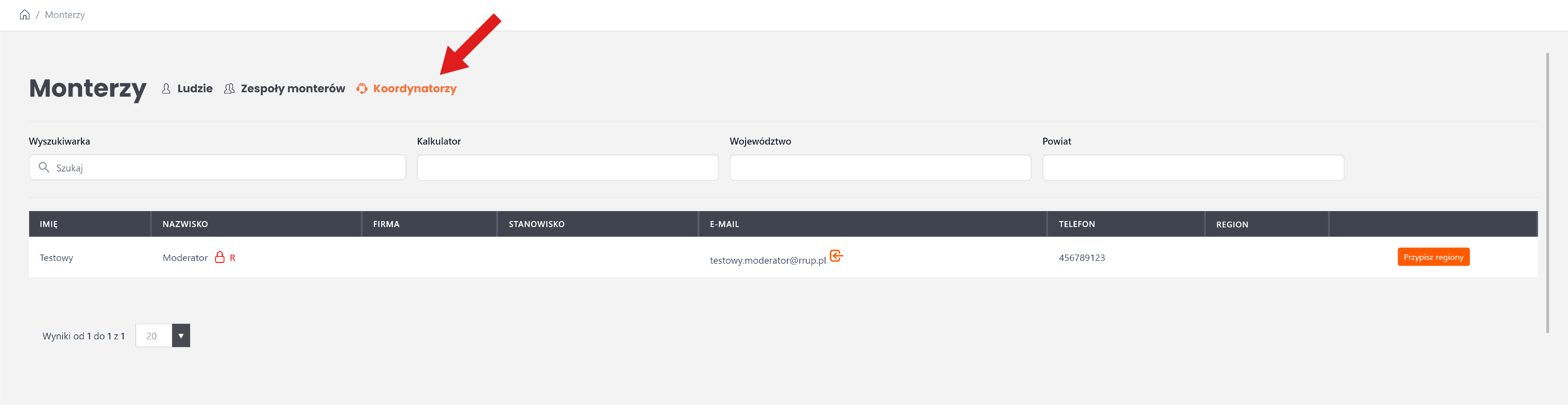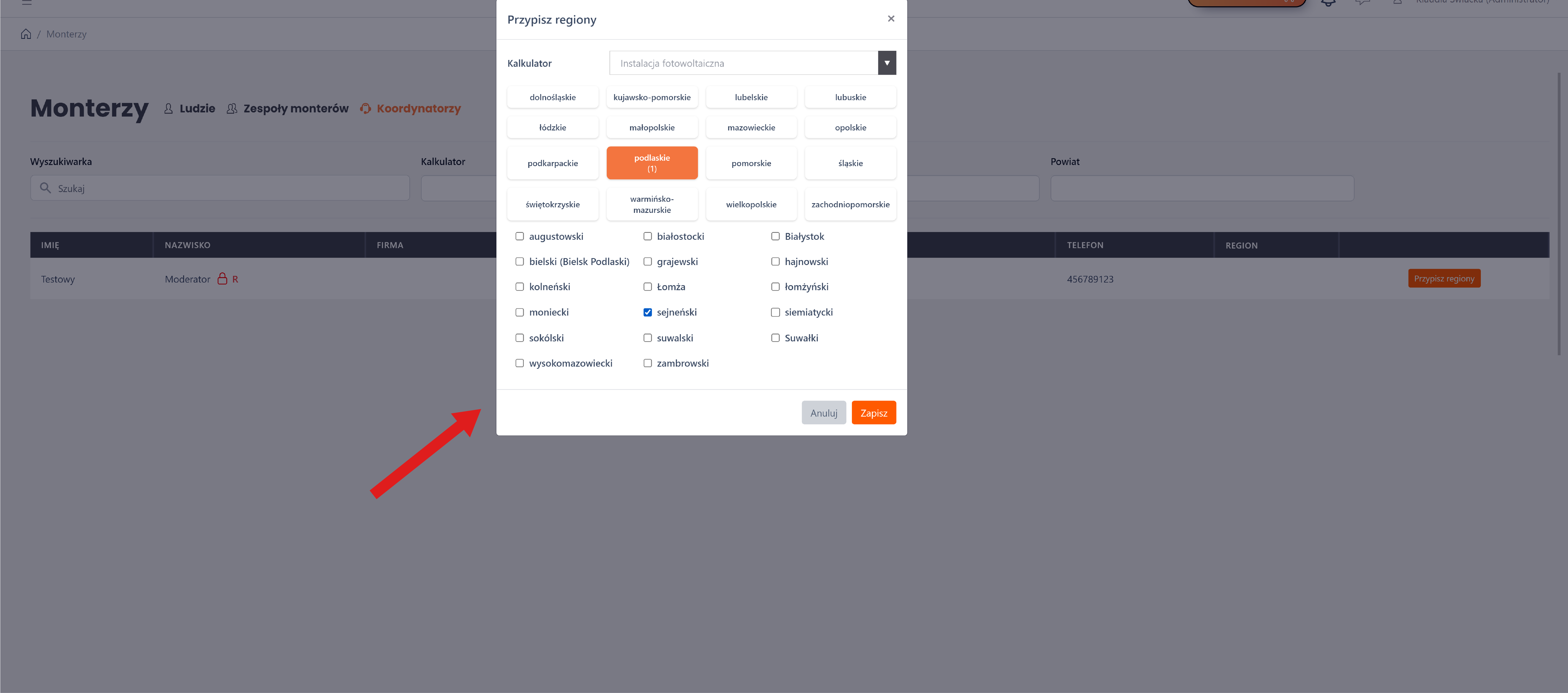 W zakładce "Montaże" -> "Koordynatorzy" możliwe jest zarządzanie listą koordynatorów oraz przypisywanie im konkretnych kalkulatorów oraz regionów.