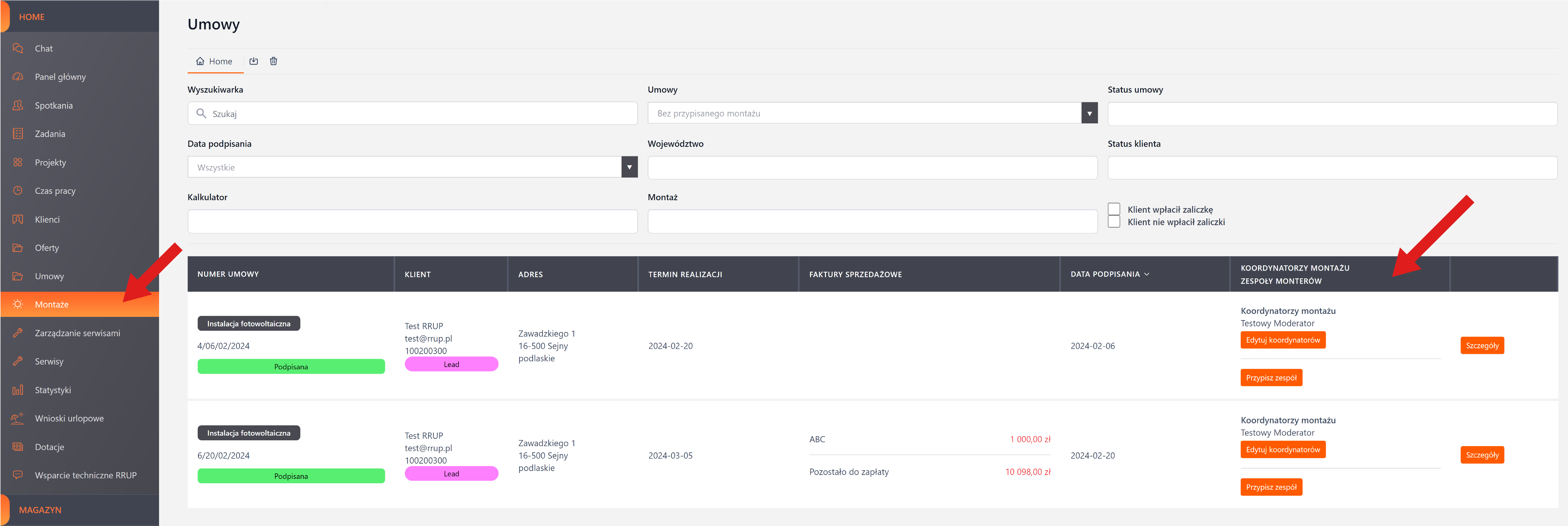 Koordynatorzy mają dostęp jedynie do tych montaży, które są im przypisane. Dzięki dedykowanemu widokowi w zakładce "Montaże", mogą oni efektywnie zarządzać ekipami montażowymi, przypisując je do konkretnych umów. To umożliwia im skuteczną koordynację zasobów i terminów montażu.