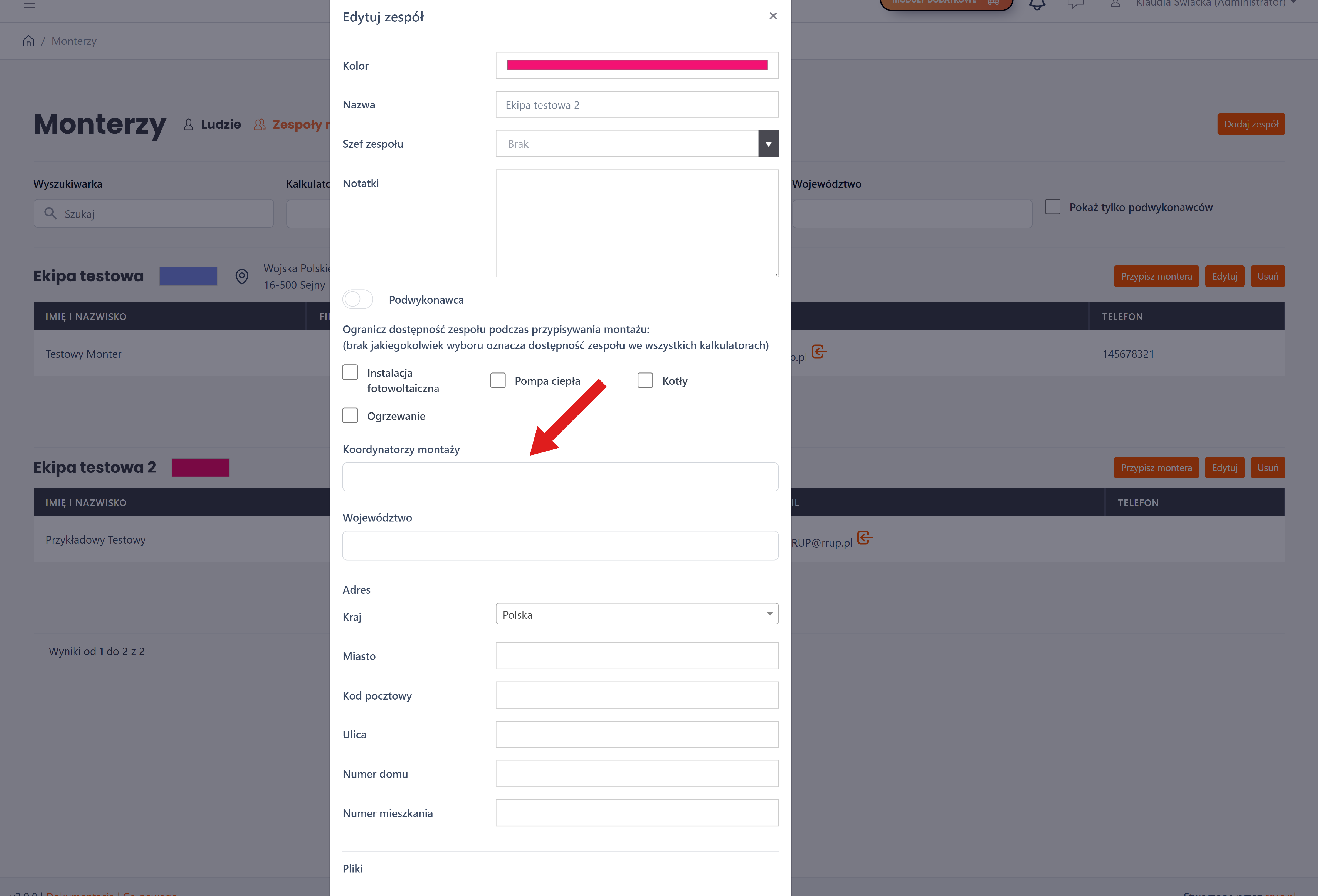 W module możliwe jest również zarządzanie dostępem koordynatorów do konkretnych ekip montażowych. Podczas edycji ekip montażowych, administrator może wskazać, którzy koordynatorzy mają mieć do nich dostęp i mogą przypisywać ich do montaży.