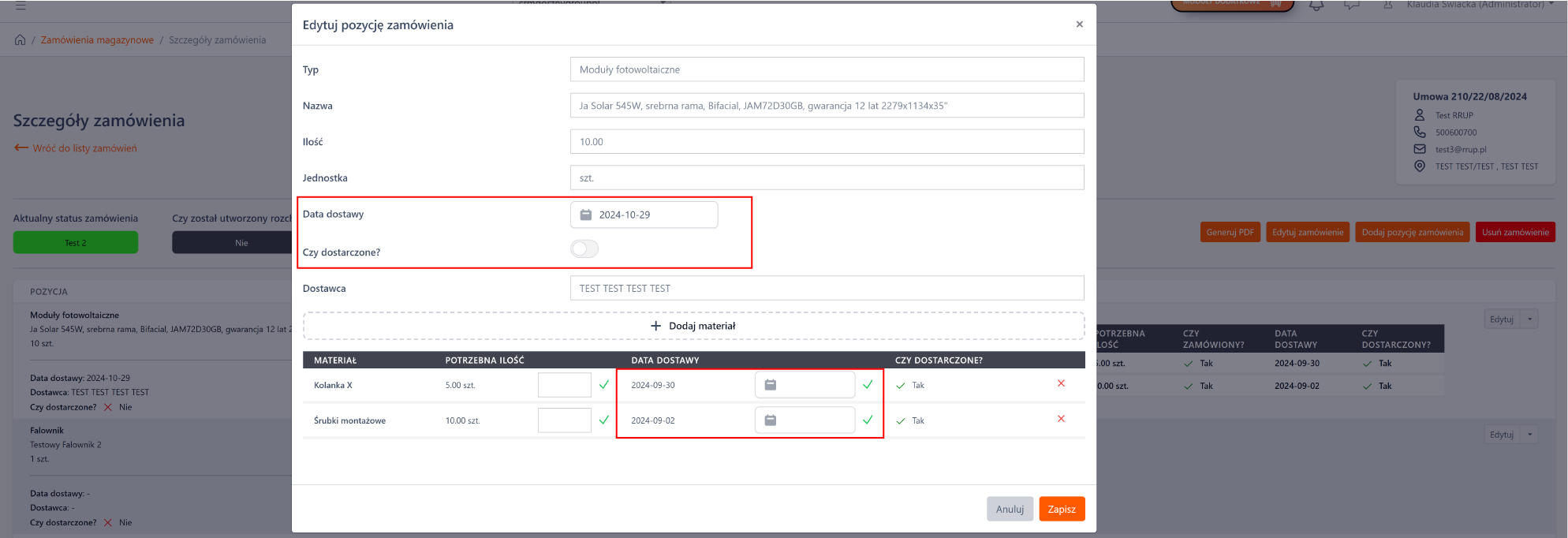 Podczas edycji zamówienia magazynowego istnieje możliwość ustawiania dat dostaw oraz statusu dostarczenia.